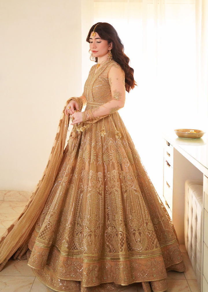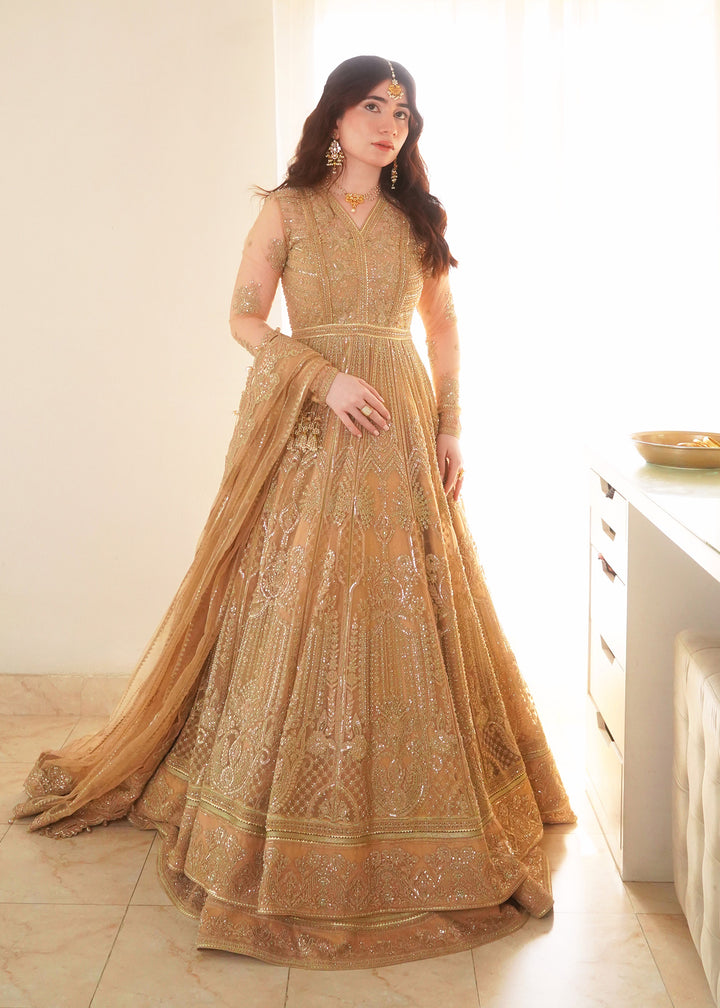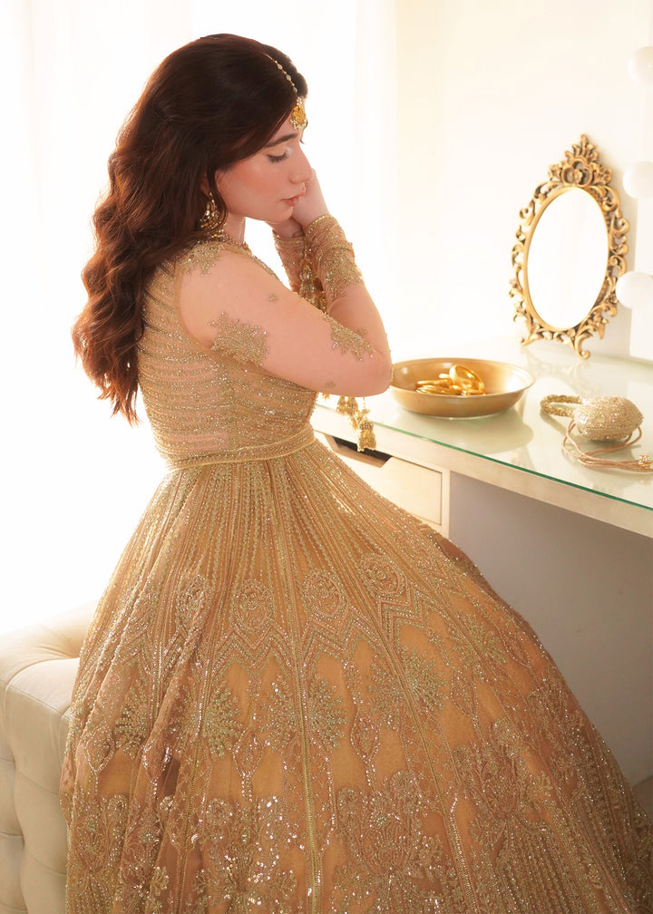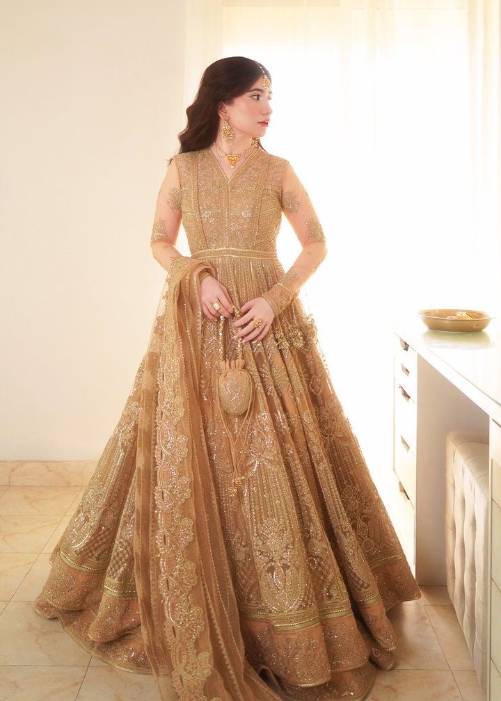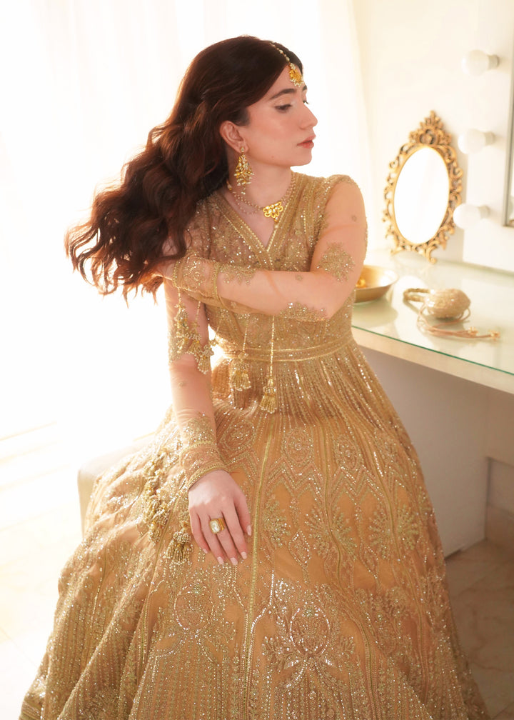 Bijou is a masterpiece of elegance and grandeur. The ensemble features an embroidered net shirt with delicate sleeves, paired with a lace-detailed net peshwas and a regal jamawar lehenga. An embroidered net dupatta completes the look, creating a timeless silhouette that is both graceful and sophisticated. Perfect for weddings and special occasions, Bijou embodies refined luxury